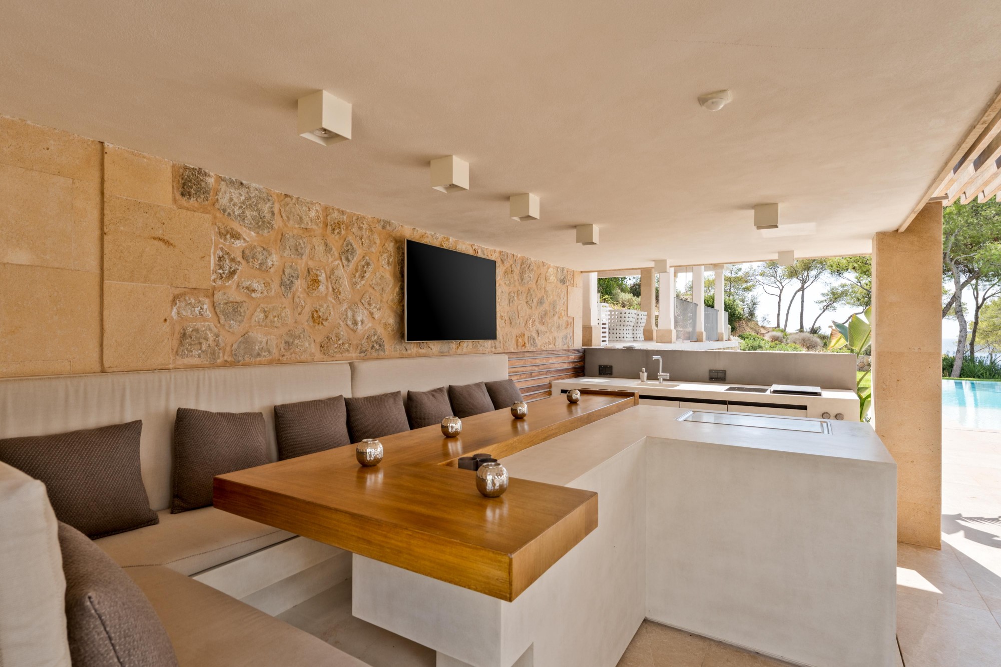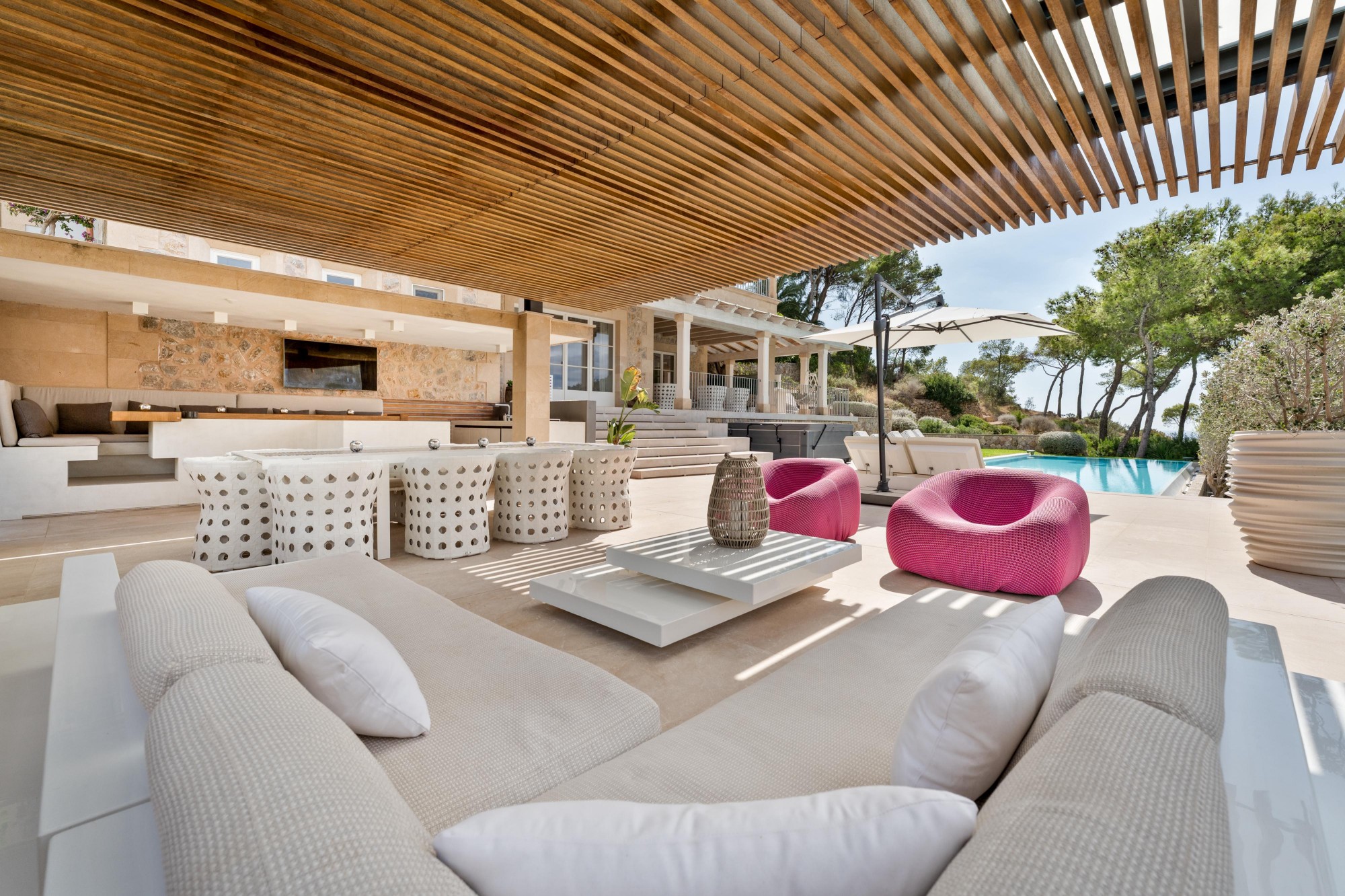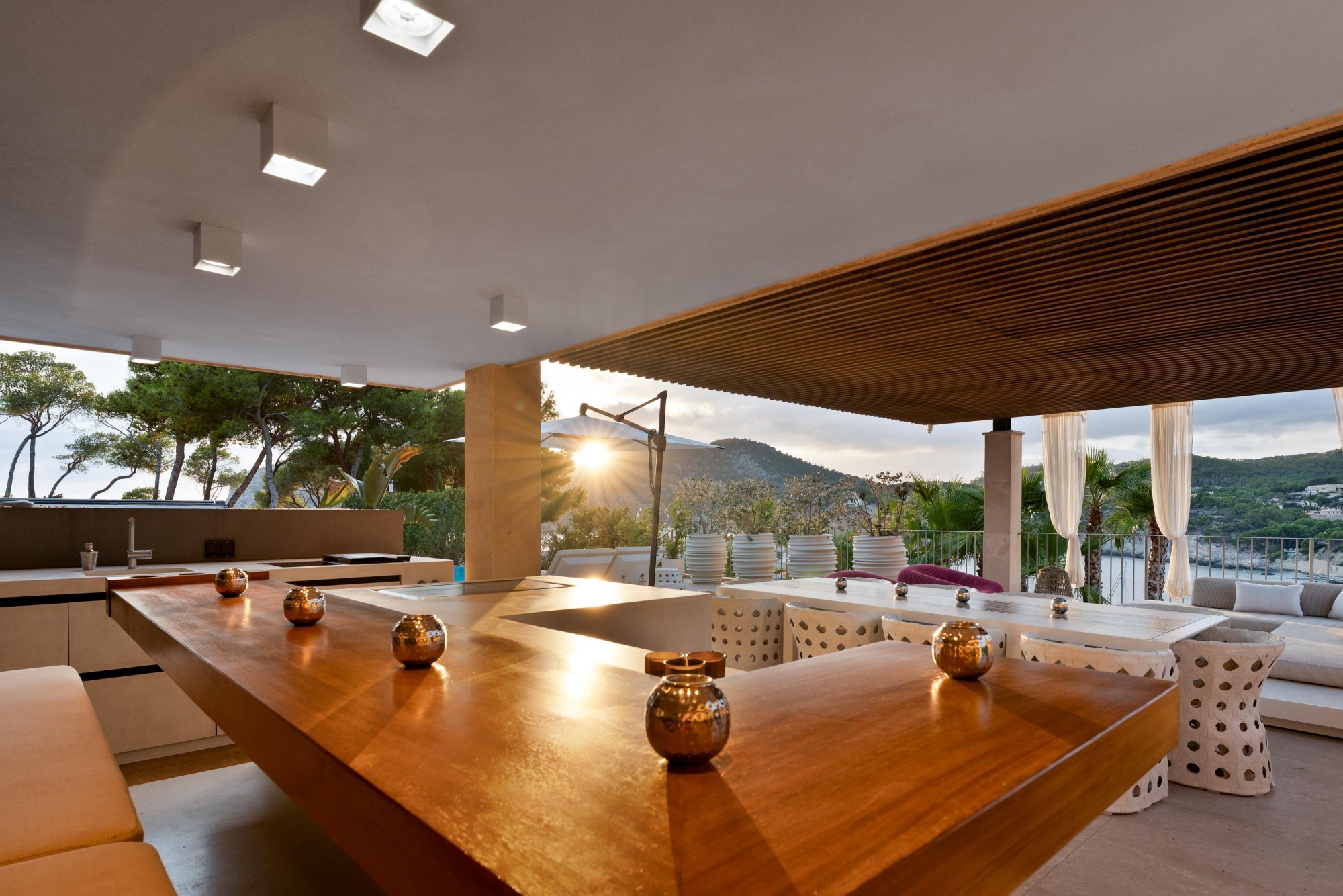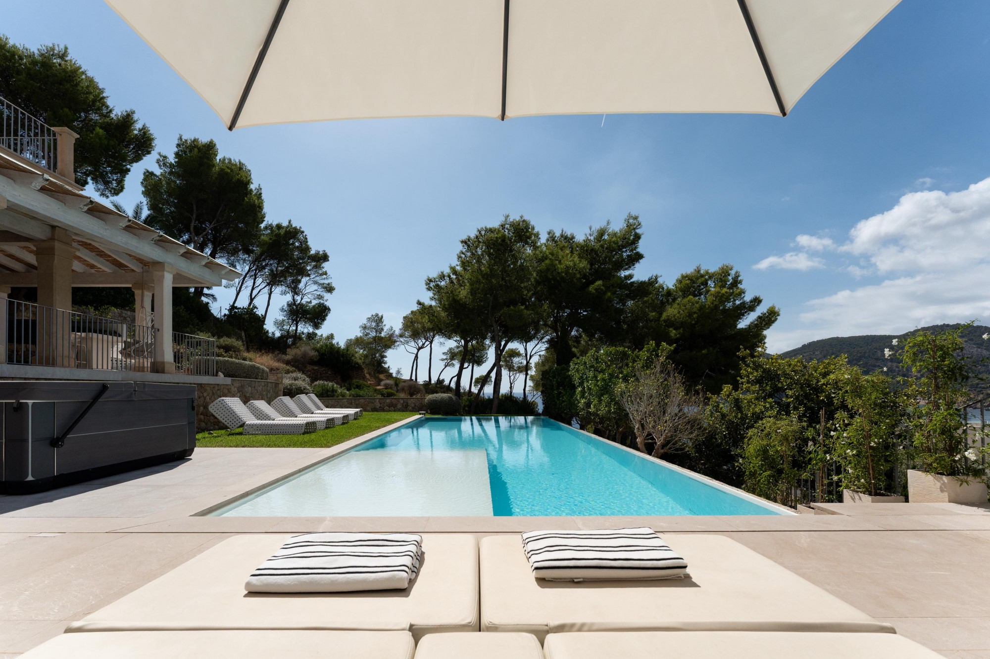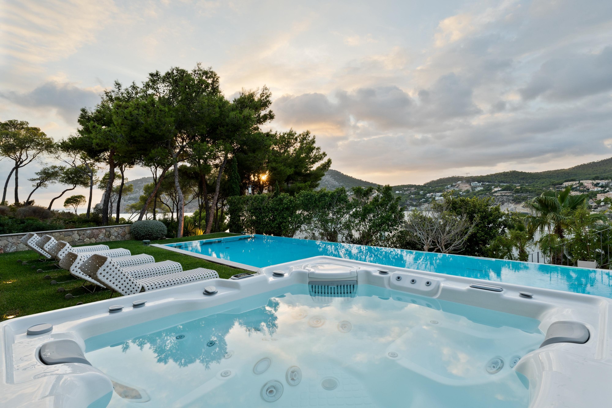 Villa Esplendida extends over three levels and 602 m² of living space. On a plot of 1,600 m², you can find your own rhythm: first laps in the heated infinity pool in the morning, in the whirlpool with a view of the bay at lunchtime, by the open fire in one of the three fireplaces in the evening. The terraces are laid out so that you have the perfect spot at any time of day - for sun, shade or just the right light. The barbecue area invites you to those evenings that last longer than planned. For all the best reasons.